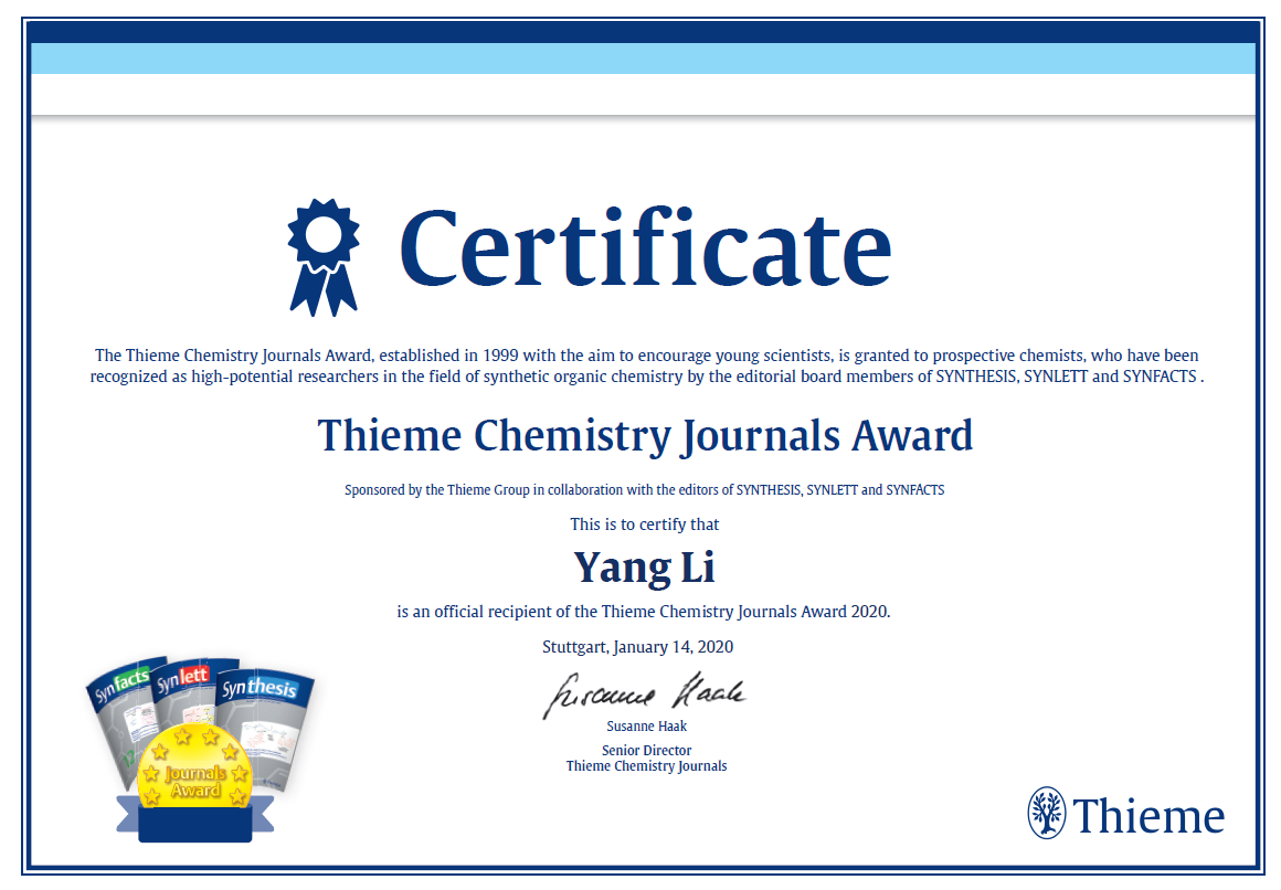近日,必赢李洋研究员获得2020年度“Thieme Chemistry Journals Award”学术奖项。