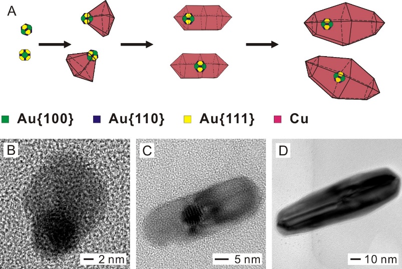 各向异性的金属纳米材料,例如纳米棒、纳米线等,通常需要孪晶纳米颗粒作为种子以打破其本身的晶体对称性,从而实现金属纳米材料的各向异性生长。因而,可控合成孪晶纳米颗粒是制备各向异性金属材料的关键。以金-铜体系为例,通过理论计算和实验相结合的研究手段,发现铜原子在金单晶纳米颗粒表面沉积导致的应力可以有效诱使铜在金表面形成五重孪晶结构,并最终生长成金铜核壳纳米棒。该发现为孪晶纳米材料的制备开辟了一种新的有效途径。