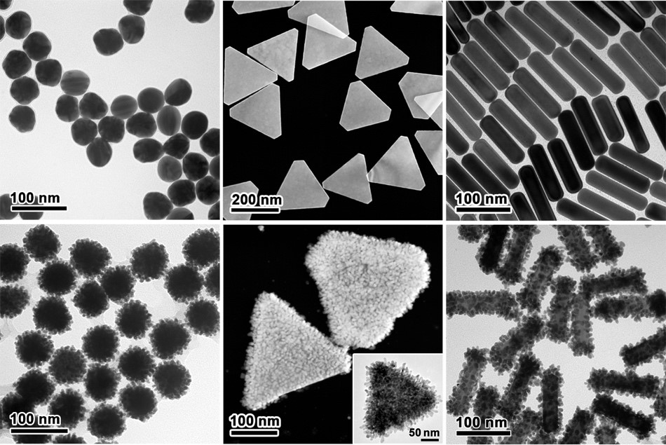 在贵金属纳米材料的表面可控构筑亚尺度的结构特征有望为材料带来崭新的特性,成为贵金属纳米结构设计的新思路。例如,在金银纳米晶的表面制备高密度的岛状结构,可通过耦合效应产生特殊的表面等离子体共振性质,在表面增强拉曼散射(SERS)、生物传感、成像和光催化等领域具有重要的应用价值。通常在单一金属或具有相同晶格常数的金银体系中,晶体生长遵循层状生长模式,不利于亚尺度结构特征的形成。