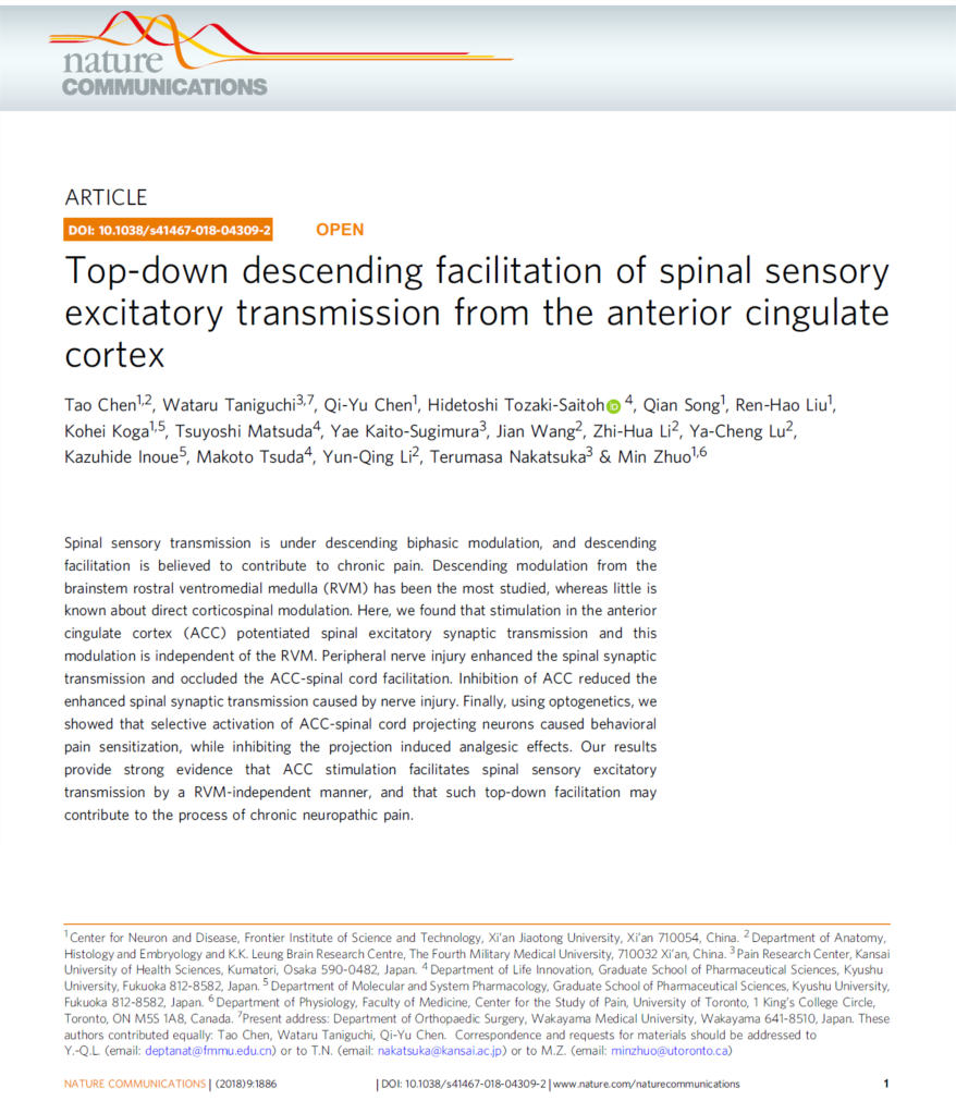 2018年5月14日,我校必赢网络游戏平台(FIST)-神经与脑疾病研究中心(CND)的研究论文Top-down descending facilitation of spinal sensory excitatory transmission from the anterior cingulate cortex《前扣带回下行增强脊髓兴奋性感觉传递》,被Nature期刊旗下子刊Nature Communications(自然-通讯)杂志正式发表。此项研究首次证实脑内存在感觉调控皮层向脊髓的直接投射,参与脊髓痛觉信息的增强效应。同时,该效应与脑干痛觉调控系统不直接相关。