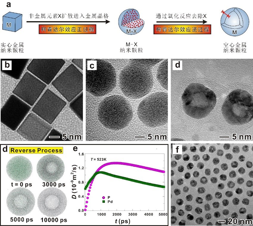 图1 (a)通过柯肯达尔效应正逆过程结合制备空心金属纳米颗粒的示意图以及