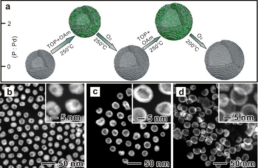 以金属钯纳米材料为例,该研究团队首先在氮气保护下将磷扩散进入钯纳米颗粒形成磷化钯(PdP2),因磷向内扩散快于钯原子的向外扩散,磷化钯是实心粒子。在油胺溶液中通过一定的氧气氛围高温加热(250 °C),磷化钯表面的磷被氧化,而磷化钯颗粒内部的磷通过扩散到达表面,因其向外扩散速度高于钯原子的向内扩散,进而在纳米颗粒内部形成空位,这些空位逐渐积累合并形成大空穴,最后得到中空结构的金属钯纳米颗粒,如图1, b-d所示。由于在合成过程中,磷的氧化速度可以通过氧气氛围精确调控,因此这种方法可以进一步调控中空金属钯纳米颗粒的空穴大小。