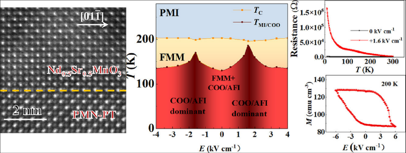 图4 (011)NSMO/PMN-PT外延异质结的原子结构、温度-电场相图、电致阻变和电控磁性