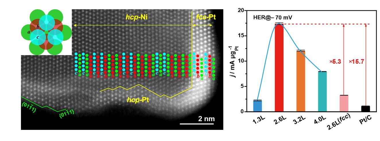 为此,西安交大高传博教授团队提出以非贵金属镍为模板合成亚稳相铂基纳米催化材料。通过采用油胺与铂盐的配位反应,有效抑制了铂盐与镍纳米材料之间的置换反应,实现了亚稳六方相铂在镍非(0001)晶面上的可控形成和精准的厚度调控。镍模板不仅降低了催化剂的成本,还通过核壳间应力和电子转移效应,有效调变了亚稳六方相铂壳的电子结构。基于以上策略,实现了高效的碱性电解水析氢动力学,其在–70 mV过电势下的催化活性达到17.4 mA μgPt–1,是迄今报道的最高性能。这项研究为金属纳米材料的晶相和电子结构调控提供了新途径,对电解水制氢等能源催化过程关键催化剂的开发具有指导意义。