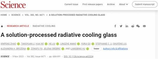 2023119日,美国马里兰大学材料科学与工程系胡良兵教授团队在Science期刊发表题为“A solution-processed radiative cooling glass”的辐射制冷技术研究论文。胡良兵教授为论文通讯作者,论文共同第一作者为赵新朋博士、李堂源博士、谢华博士、刘鹤博士,均为西安交通大学校友。其中,李堂源博士毕业于西安交通大学bwin,导师娄晓杰教授