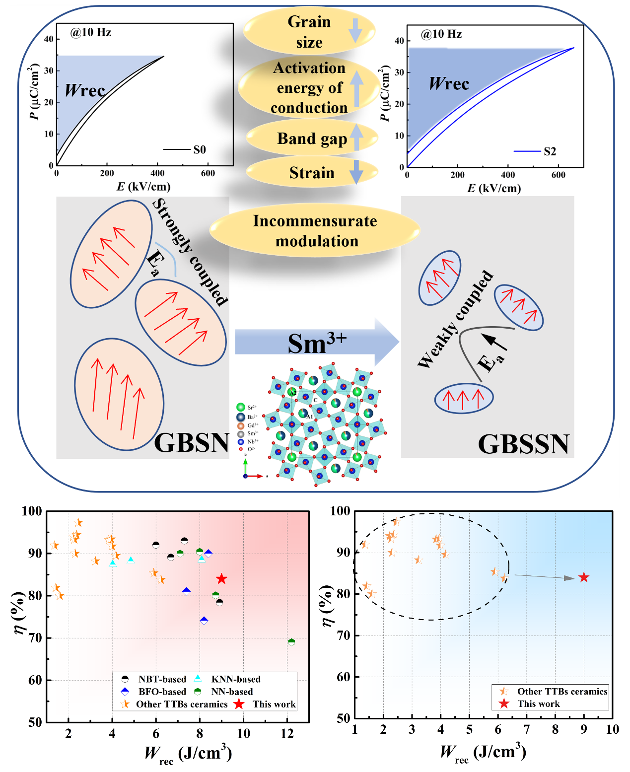 电介质储能陶瓷电容器属于无源组件类别的电能储存设备,由于其高功率密度、快速的充放电速度以及长循环寿命等优点,该类电容器有望在混合动力汽车、大功率换能器以及大功率脉冲设备中得到广泛应用。近年来,科研人员进行了大量的研究工作,致力于开发具有高储能密度和高储能效率的新型电介质材料。尽管如此,目前的研究对象主要集中于具有钙钛矿结构的铁电体、弛豫铁电体和弛豫反铁电体。四方钨青铜结构(TTBs)铁电体,作为仅次于钙钛矿结构铁电体的第二大类铁电体,由于其复杂的晶体结构和多元的元素可调性,在电介质储能方面的研究却鲜有报道。