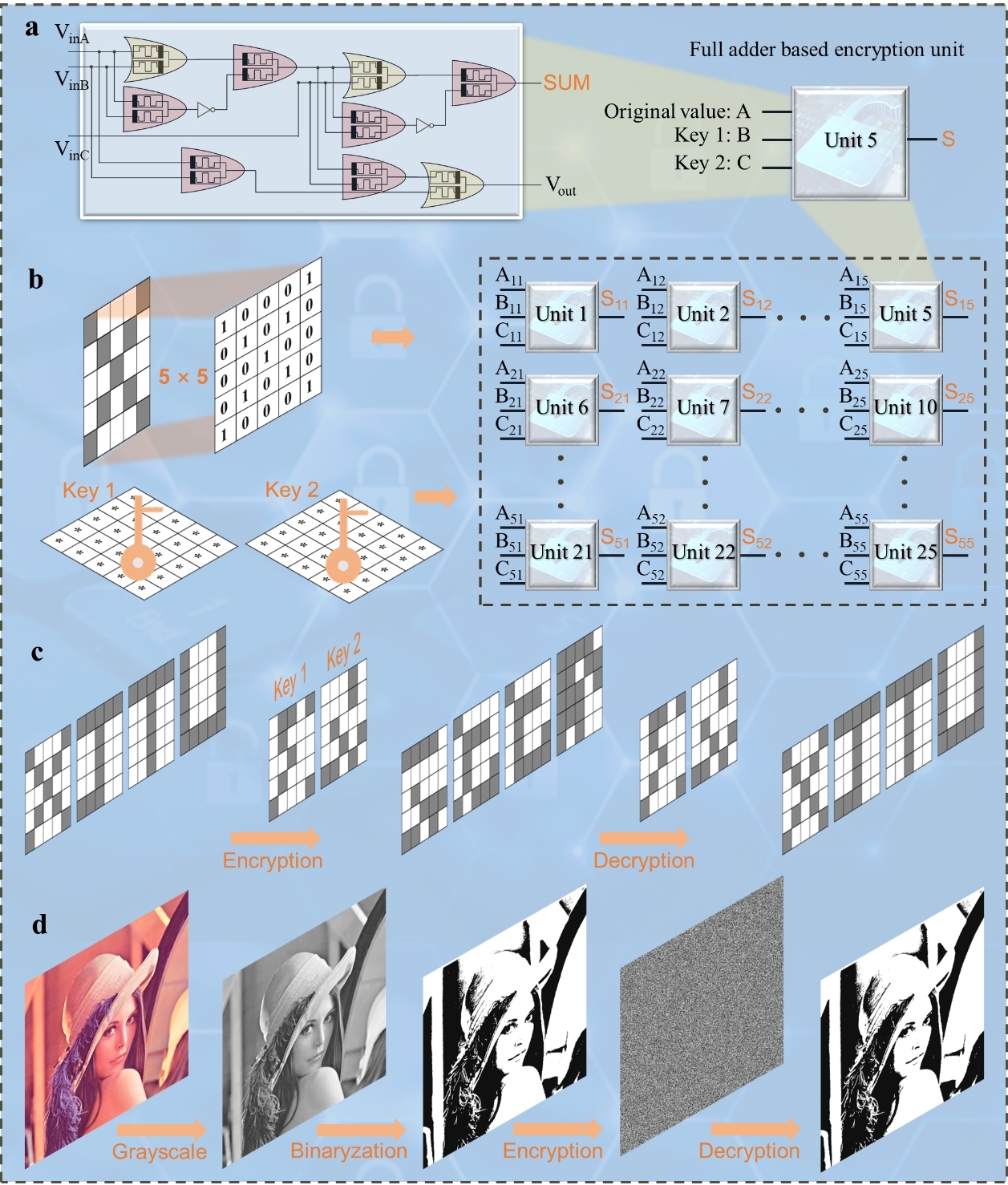 在当前这个信息大爆炸的时代,大量数据不断产生、传输和接收。如何保证数据在传输过程中的机密性和完整性成为国家、机构和个人关心的首要问题,尤其是在处理国家机密、先进设备和核心技术等敏感信息方面展现出巨大的应用前景。然而,大多数数据加密都是基于软件程序实现的,从而增加了潜在被解密的可能性。因此,探索基于硬件的加密方法无疑是增强数据安全性的一条大有可为的途径。忆阻器具有强大的逻辑计算能力、更高的集成密度和极低的功耗,被认为是最有前途的下一代电子器件,有望实现类脑神经形态计算。然而,基于忆阻器的新兴电路器件的设计及其在非常规领域的潜在应用对于实现传统电子器件无法完成的一些任务具有重要意义。特别是考虑到忆阻器与传统CMOS电路兼容,因此被视为构建逻辑电路和设计物理加密器的最有前景的候选器件之一。