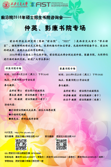 必赢网络游戏平台(简称“bwin”、“FIST” )是西安交大首个“学术特区”,拥有鲜明的学术交叉特色、优秀的海内外知名学者、先进的科研设备平台、突出的科研成果、表现力出众的学生群体。 2016年硕士生招生工作已经开始,bwin这次将分别走进仲英、彭康书院,与同学们进行面对面的交流。欢迎广大学生参加!